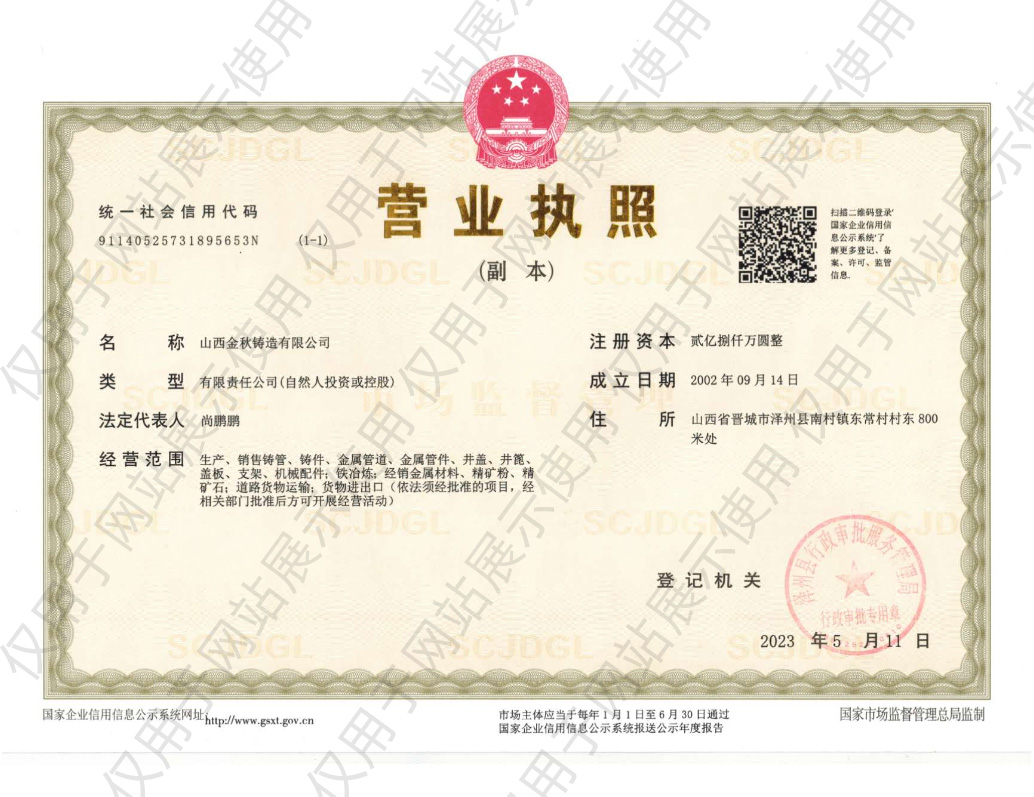 公司注冊(cè)品牌“金晉秋鑄造 JJQ-FOUNDRY”取得了ISO9001-2008質(zhì)量管理體系認(rèn)證、OHSAS18001-2007職業(yè)健康管理體系認(rèn)證、ISO14001-2004環(huán)境管理體系認(rèn)證