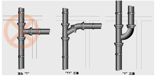 在彎頭和三通處未采用順流配件,增加了水流阻力?;蛘吲潘畽M管的兩排水口水相向流至兩口間的三通處匯集,從三通的側(cè)端承口接管排走,其弊端不僅是水流不順,而且該管段坡度不合理,極易堵塞。宜將此種“頂頭T”的做法改為彎頭加順?biāo)ǎㄊ欠窀臑閅三通或TY三通)相錯開,避免不同方向的排水在平面上正交相遇。