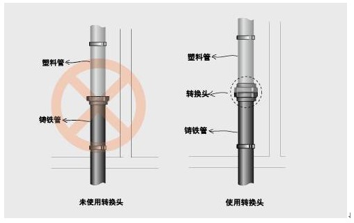 塑料管與鑄鐵管混用時,需用轉(zhuǎn)換接頭連接。