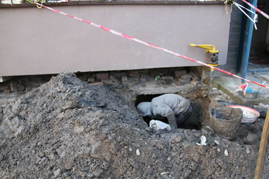 維修工人正在深坑內更換新的鑄鐵排水管