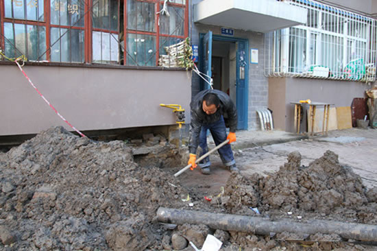 隨即記者來到徐先生家所住的新村5-5二單元,維修人員正在所刨的坑內換新的排水管,府民物業(yè)維修隊隊長張合平告訴記者:“由于排水管埋在地下兩米處左右,排查起來比較麻煩,這正是基礎墻中間的鑄鐵排水管斷裂,所以要把屋里屋外地下排水管都打通才能進行維修?!睋?jù)了解,從29日開始,維修人員就對新村 5-5二單元的下水道進行排查。