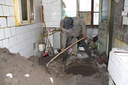 維修工作已經(jīng)完成,工作人員正在為一樓住戶家中所挖深坑進行填補恢復。